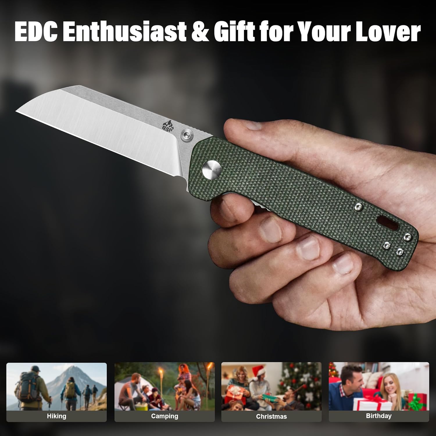 QSP Penguin V2 Folding Pocket Knife, 3.06" D2 Two Tone Finish Stonewash Satin Blade EDC Knife, Green Micarta Handle, Liner Lock, Ceramic Ball Bearings, Reversible SS Deep Carry Clip