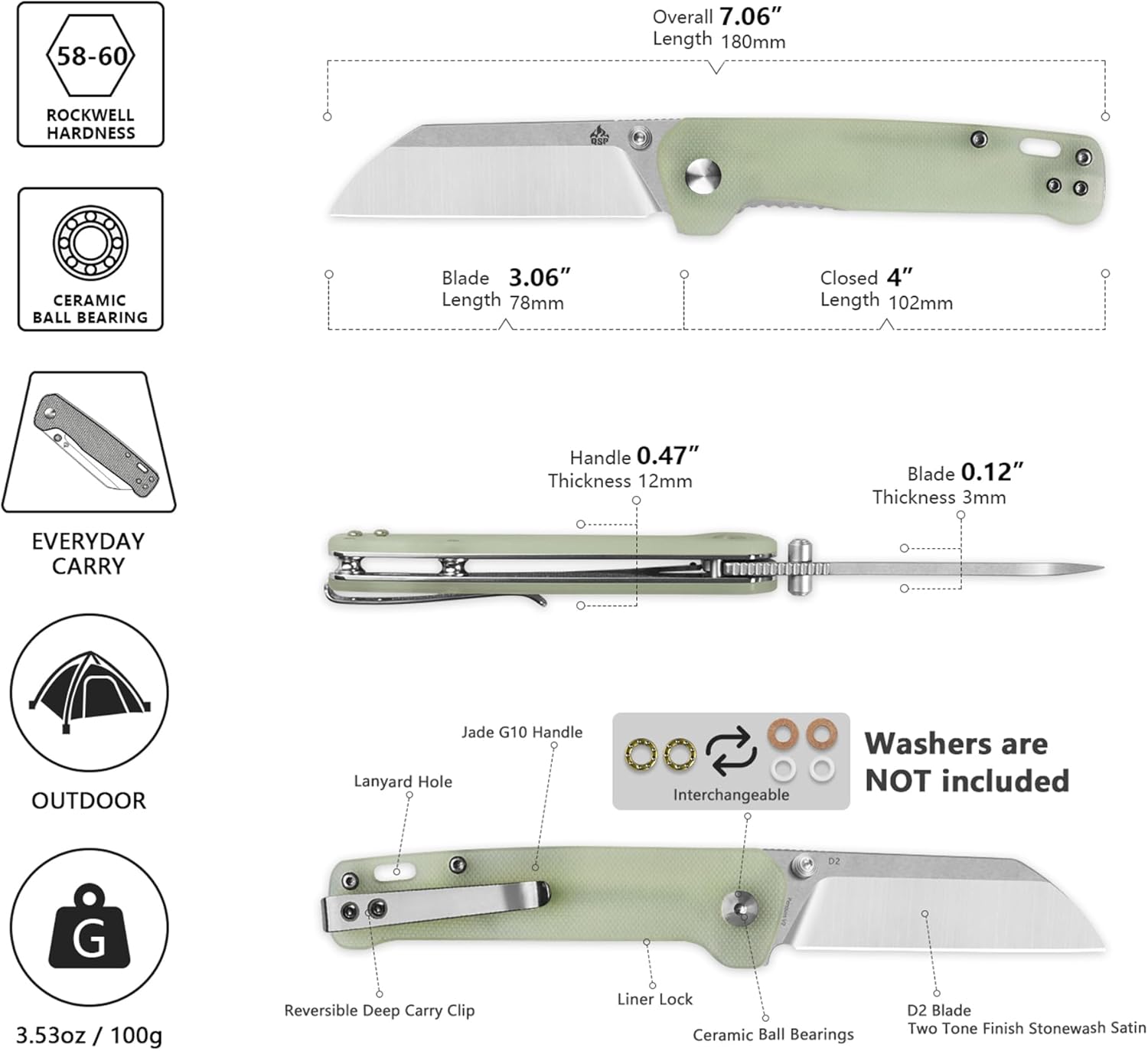 QSP Penguin V2 Folding Pocket Knife, 3.06" D2 Two Tone Finish Stonewash Satin Blade EDC Knife, Jade G10 Handle, Liner Lock, Ceramic Ball Bearings, Reversible SS Deep Carry Clip