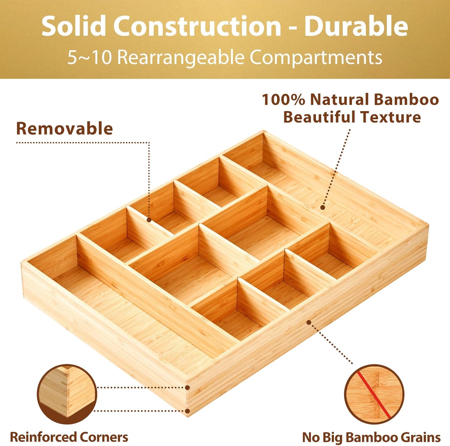 Umilife Extra Large Bamboo Desk Drawer Organizer, Wood Junk Organizer Tray with Adjustable Dividers, Anti-Skip Storage Organization in Office Bathroom Drawer for Vanity, Makeup, 17" x 12"