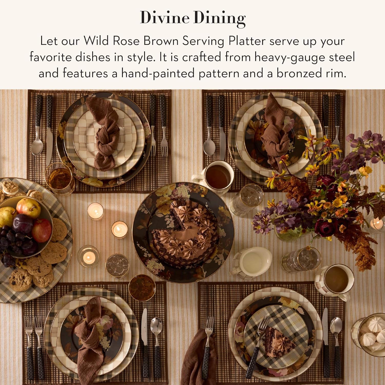 - ELEGANT SERVING ESSENTIAL: Our Wild Rose Brown Serving Platter is made with heavy-gauge steel and rimmed in bronzed stainless steel. It features hand-decorated mocha and dusty-rose floral transfers with color-dragged accents on a dark espresso background.