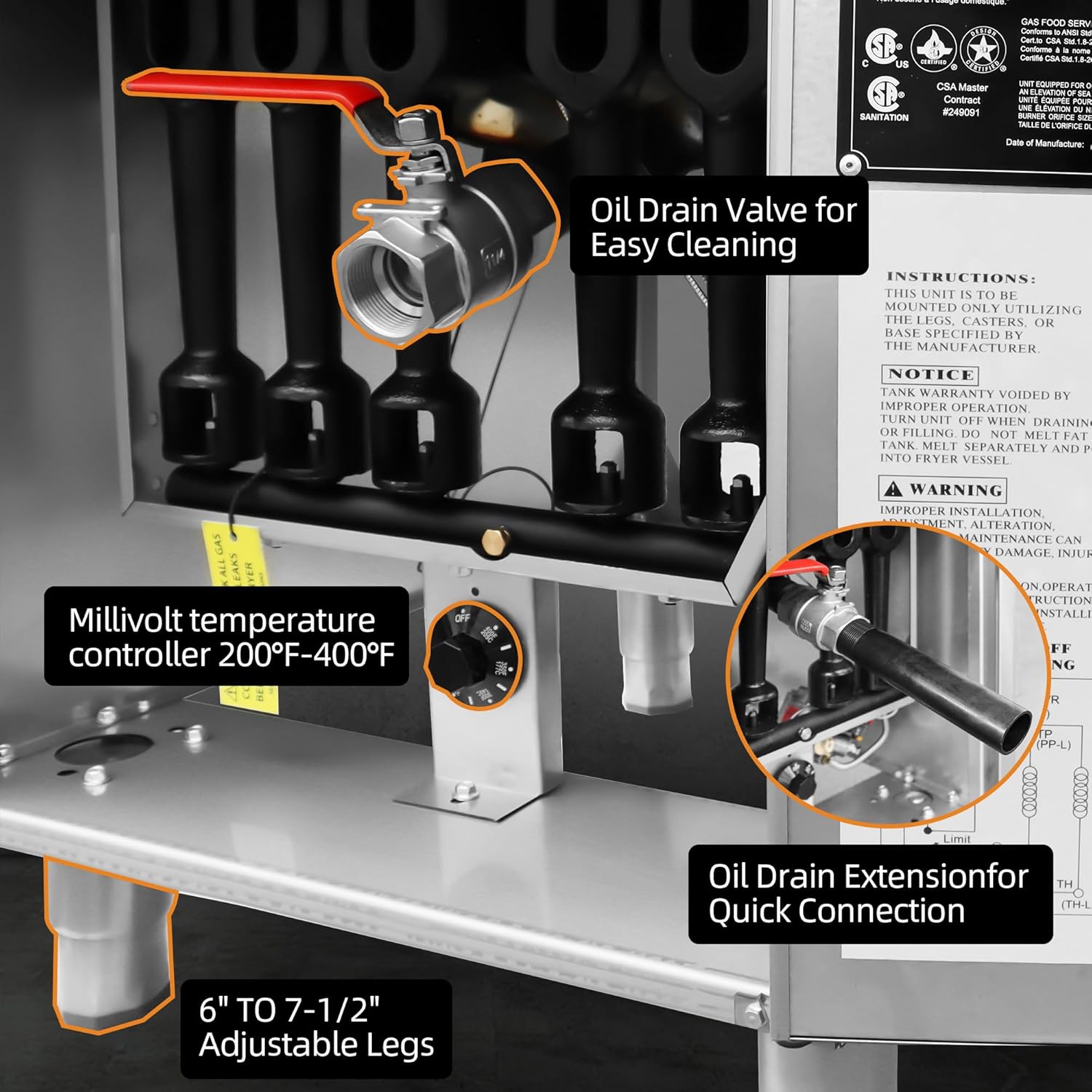 - Industrial-Grade Durability Meets Smart Design: Constructed with 430 stainless steel, CSA design certified, NSF listed the fryer’s seamless interior and reinforced weld points resist grease buildup and corrosion. The 5-tube burner system distributes heat evenly across the cooking surface. Integrated flame failure protection and automatic 450°F shutoff exceed commercial kitchen safety standards