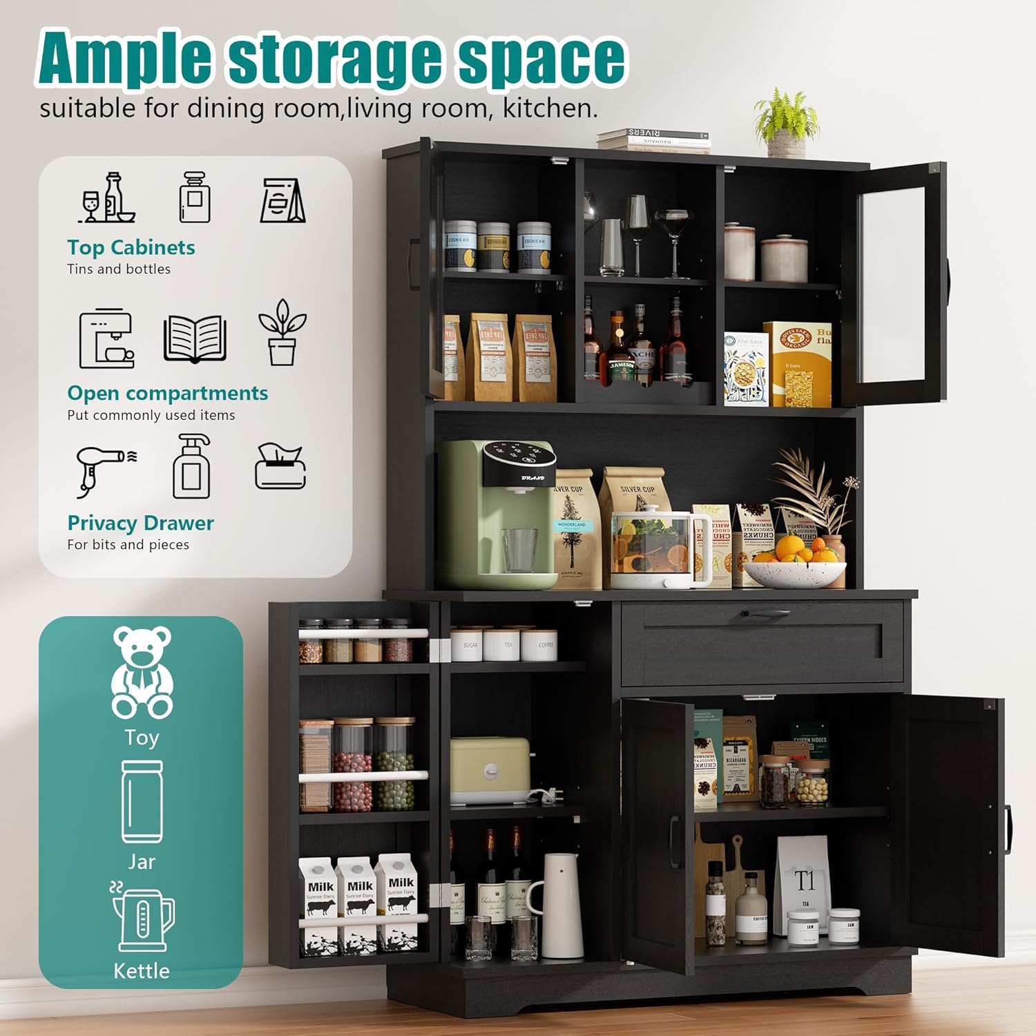 - Large Kitchen Pantry: 7 compartments, 1 removable wine rack and 2 acrylic cabinet doors customize the perfect food storage solution for kitchen and dining area. Spacious countertop can accommodate effortlessly microwave and coffee maker.